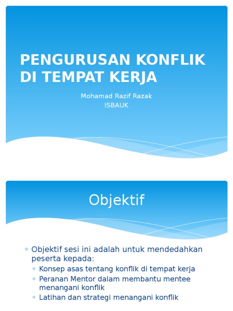 Sebagai contoh perbezaan kepentingan mereka dalam sesebuah organisasi itu mestilah mereka fahami agar kedua-dua pihak ini tidak berselisih. Ii Perselisihan faham antara adik-beradik tidak akan berpanjangan dan mereka akan berbaik-baik semula. Program Mentor USM 2007 3 Aturcara Pengenalan Jenis Konflik di Tempat Kerja 1.