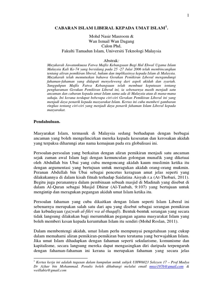 Maka apabila ia berlaku salah faham mengenai Islam pun terjadi dan menebal dalam sanubari sebahagian pemikiran umat Islam orang-orang yang melakukan tugas-tugas dakwah dalam kalangan ulama para ustazustazah penceramah disinonimkan dengan ekstrim terrorist atau. Kitalah yang mesti memastikan Islam tidak disalahfahamkan lagi baik dari segi ilmiahnya mahupun dari segi amaliahnya. Aliran Pemikiran Islam Liberal melihat bagi m emerdekakan wanita Islam dari belenggu ke jumudan salah satunya melalui pemahaman aurat.