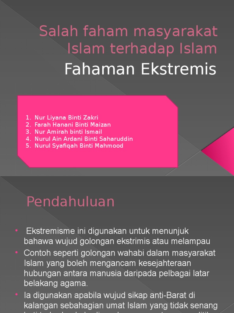 SALAH FAHAM TERHADAP ISLAM Berdasarkan pandangan umum yang disuarakan oleh golongan bukan Islam di media seperti melalui tulisan berita komen ulasan dan sebagainya maka ternyata Islam dan umatnya sentiasa digambarkan dalam bentuk yang negatifUmat islam digambarkan sebagai umat yang berpecah belahsuka akan keganasan kolot dan sebagainyaContoh salah faham golongan bukan Islam terhadap. 20 PENYATA MASALAH Secara umumnya kajian ini berfokus kepada salah faham terhadap Islam yang berlaku di Malaysia mahupun di negara-negara Islam yang lain. Hal ini kerana kebanyakkannya perilaku umat Islam itu dianggap direstui di dalam ajaran agama Islam sedangkan Islam tidak pernah merestui perbuatan yang keji sehingga mengakibatkan orang bukan Islam memandang perbuatan itu seolah-olah direstui dan datang dari ajaran Islam.
