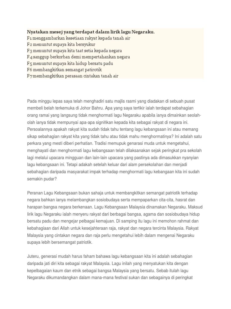 Nyatakan Mesej Yang Terdapat Dalam Lirik Lagu Negaraku